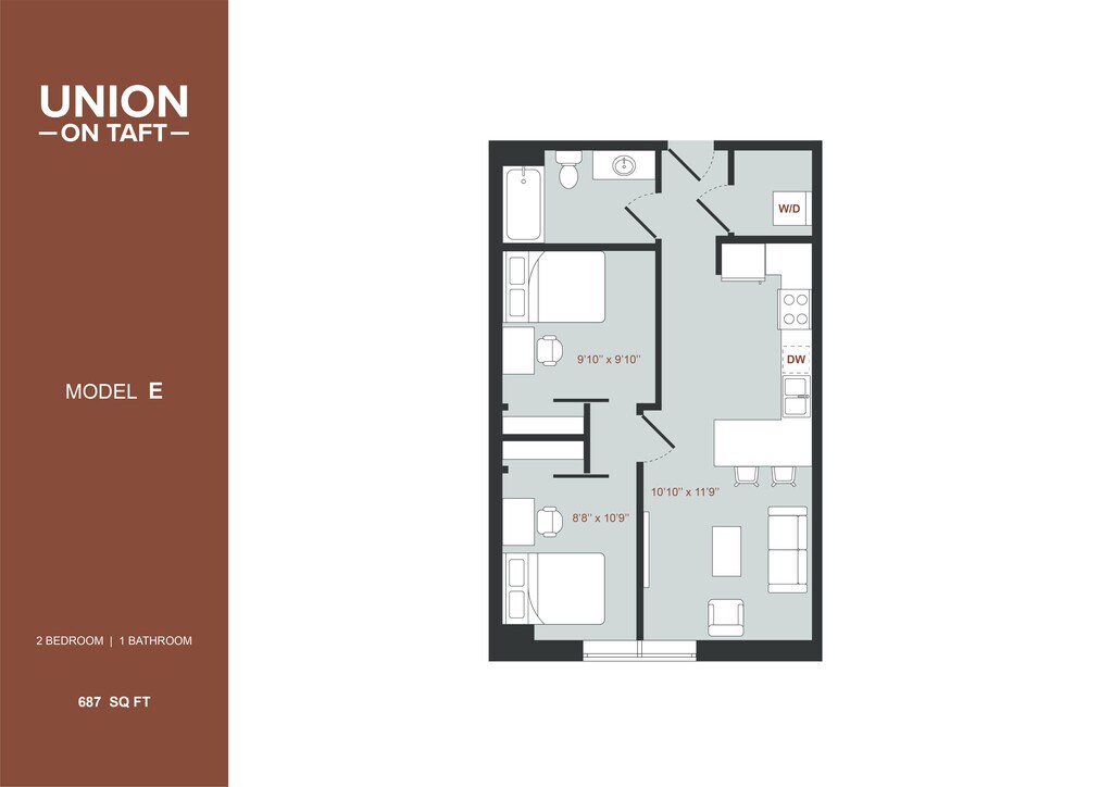 Modelo de apartamento: 2 Bedroom Model E | Double Occupancy$1,6502 Dormitorios, 1 Baño, 687 sq ftDisponible August 15, 2026PlanosFotos![]()