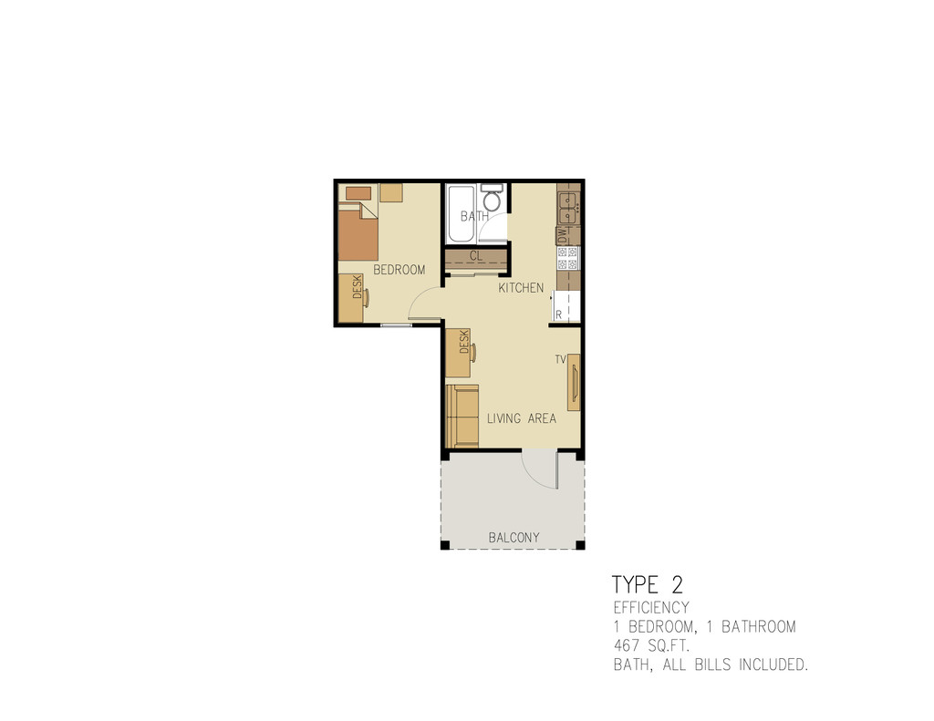 1 Dormitorio, 1 Baño, 467-580 pies²Galería del Modelo
