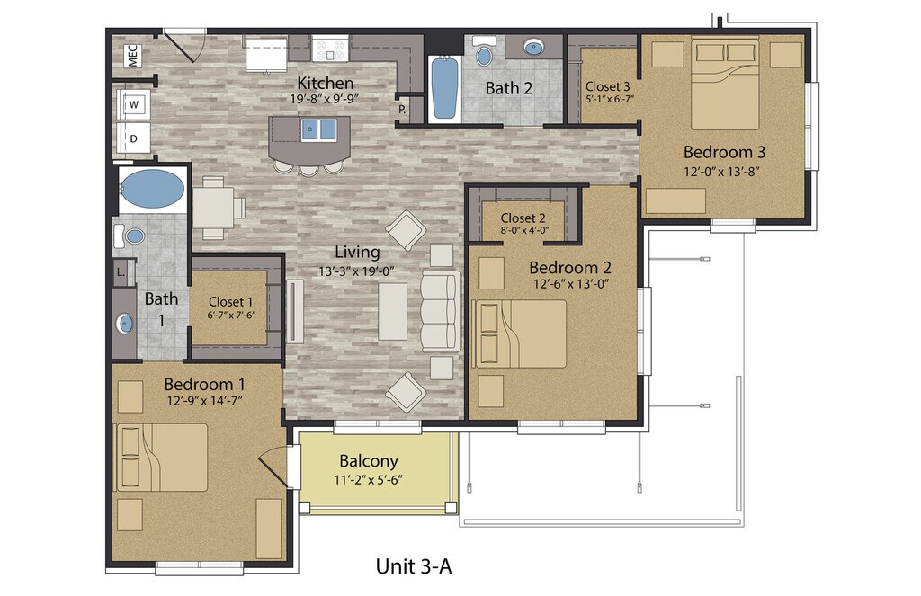 Modelo de apartamento: 3-A Type A3 Dormitorios, 2 Baños, 1329 sq ftNo Disponible![]()