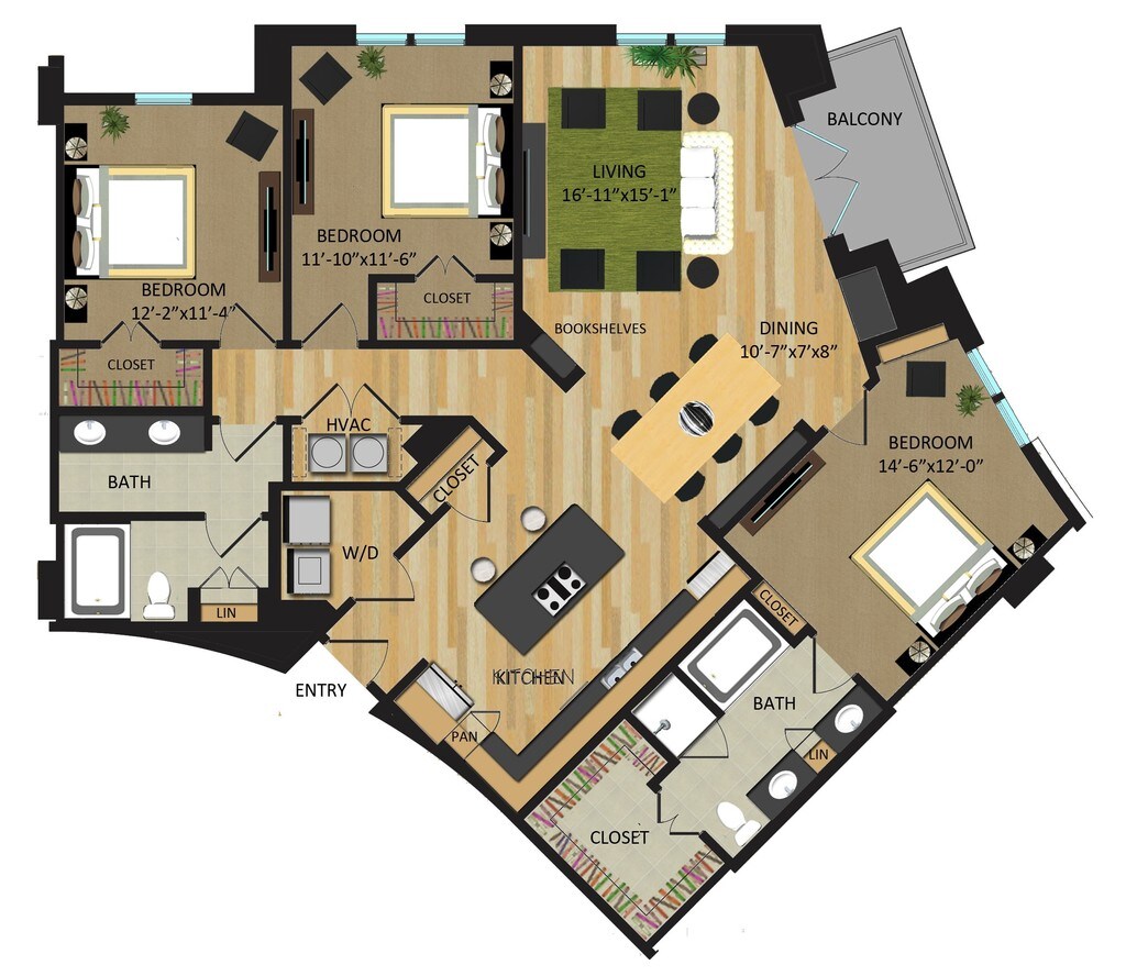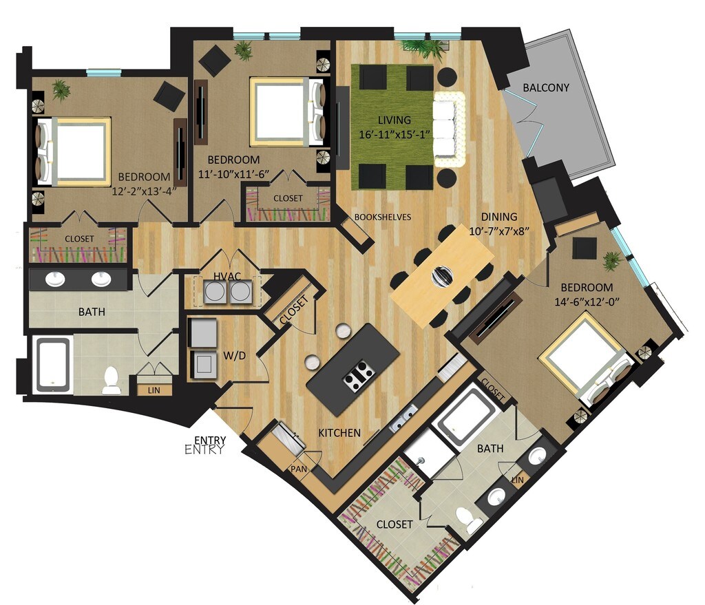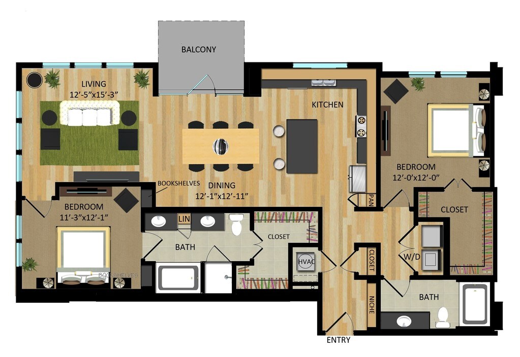 Modelo de apartamento: A3Desde $2,1561 Dormitorio, 1 Baño, 834 sq ftDisponible December 11, 2025![]()