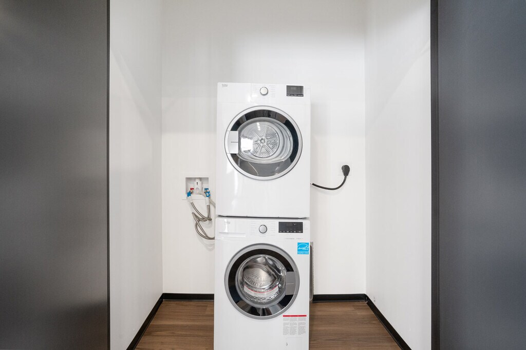 - Los planos de planta de 1 y 2 habitaciones cuentan con refrigerador de acero inoxidable, lavavajillas, microondas y estufa.