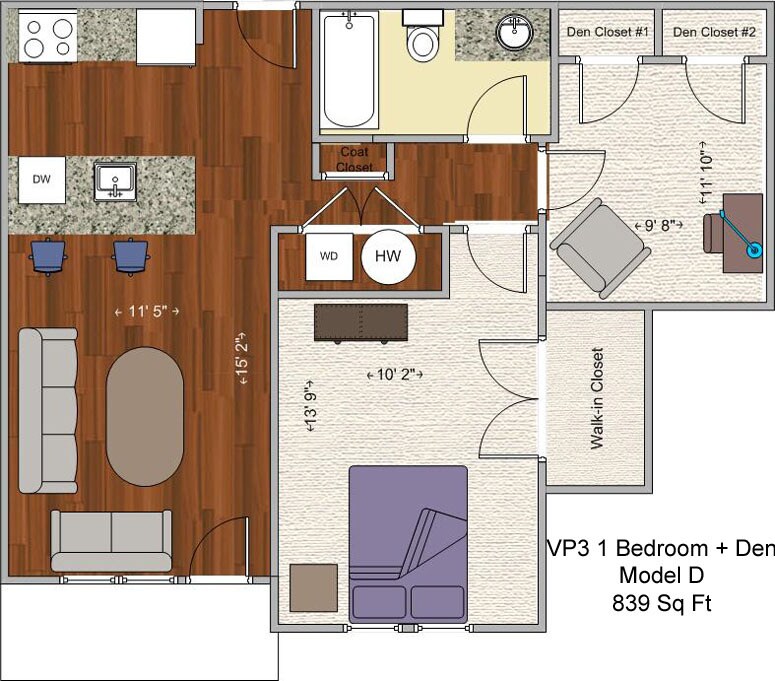 Modelo de apartamento: 1 Bedroom Plus Den - Model D$1,9401 Dormitorio, 1 Baño, 839 sq ftDisponible August 15, 20261 Bedroom Plus Den - Model D - Plano 1 1 Bedroom Plus Den - Model E