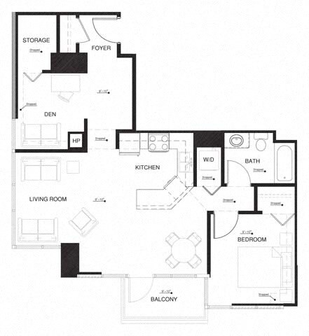 Modelo de apartamento: 1S Den w Balcony1 Dormitorio, 1 Baño, 718 sq ftDisponible March 27, 2026Los planos son representaciones artísticas. Todas las dimensiones son aproximadas. El producto y las especificaciones reales pueden variar en tamaño o detalle. No todas las características están disponibles en cada vivienda en alquiler. Por favor, consulta con un representante para obtener más detalles.