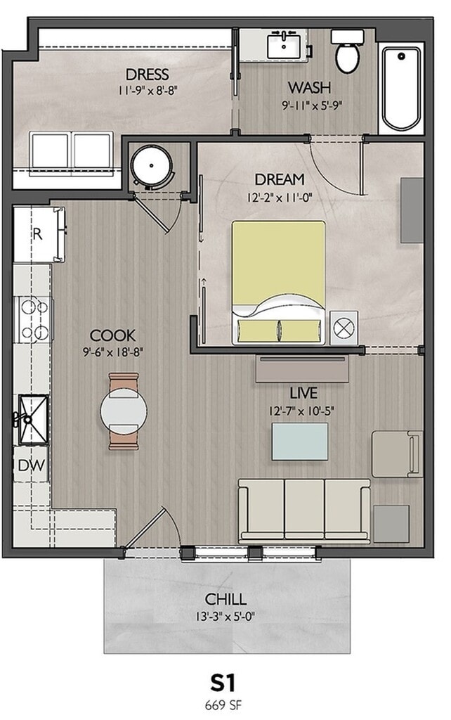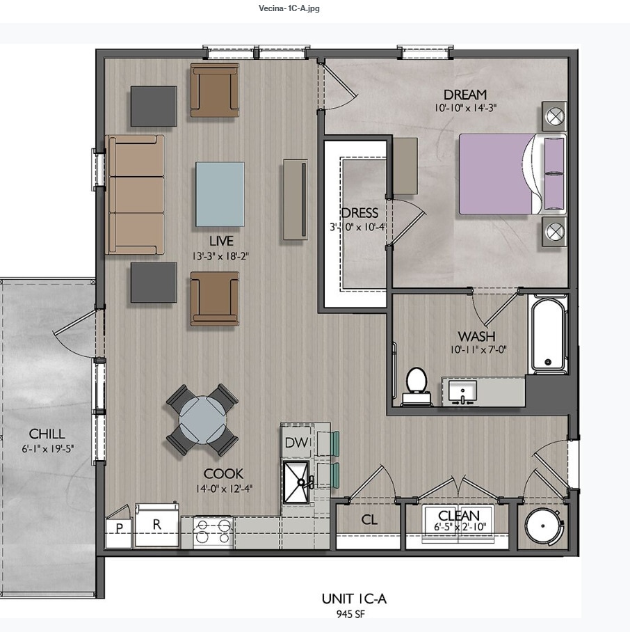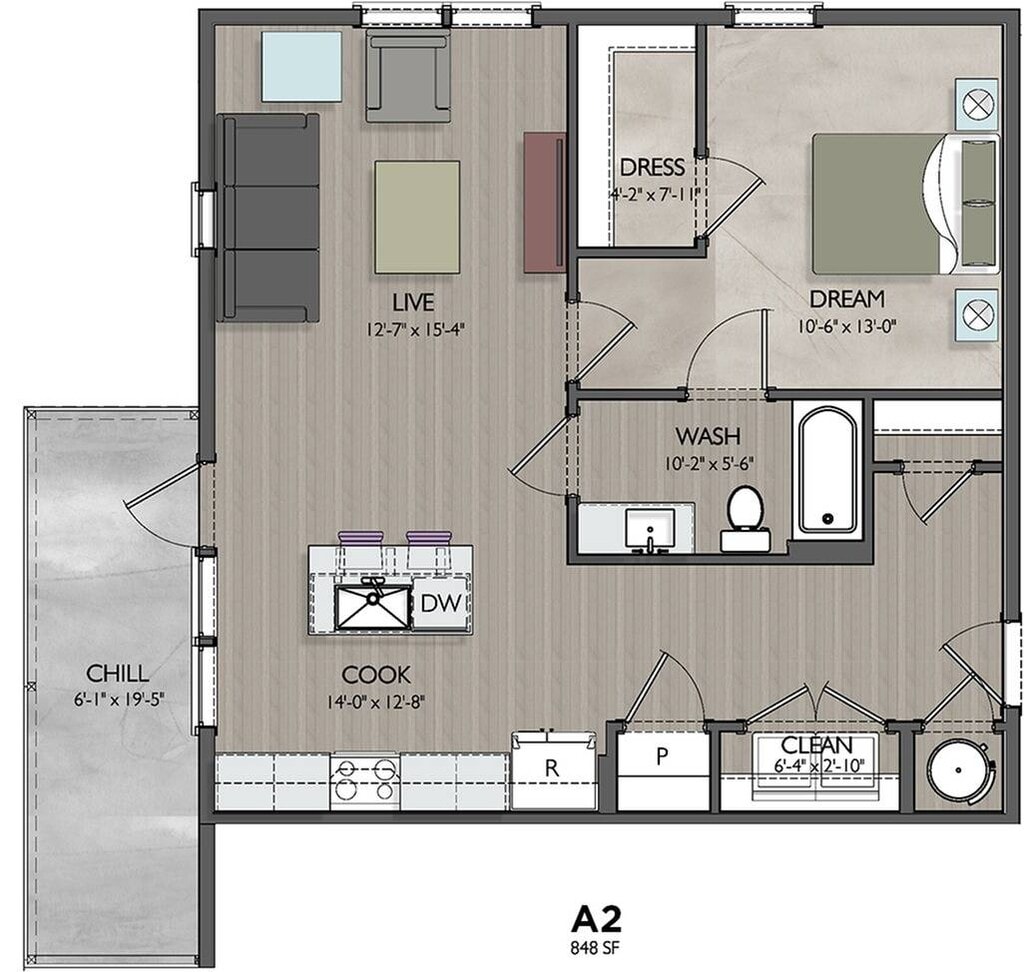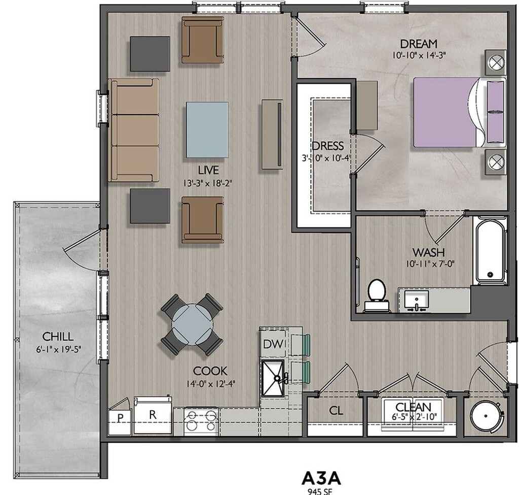 1 Dormitorio, 1 Baño, 819 pies²Disponible AhoraGalería del Modelo