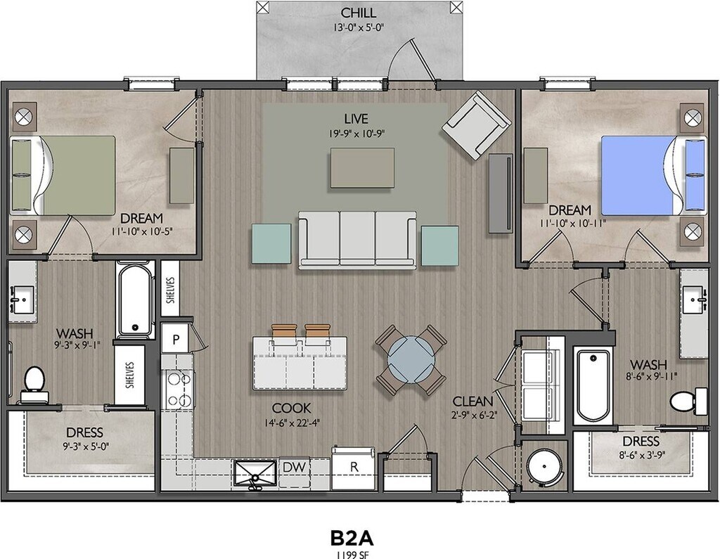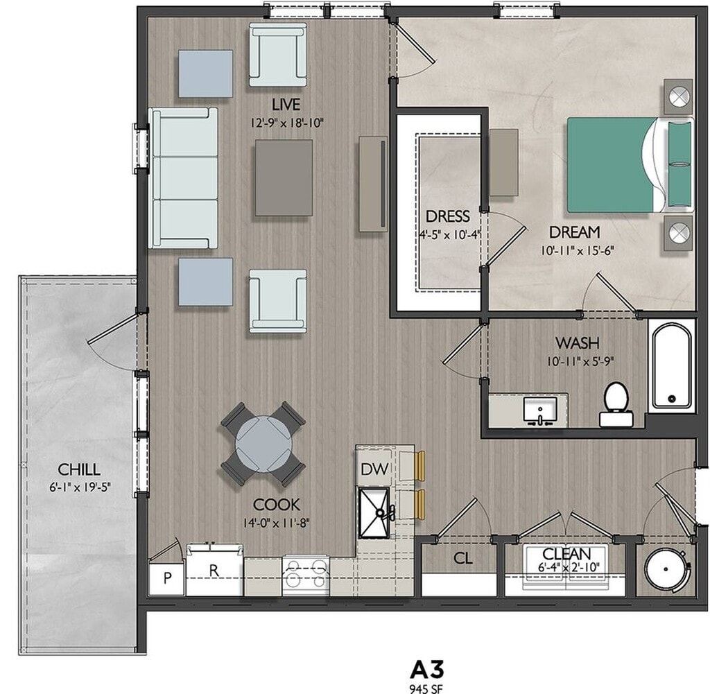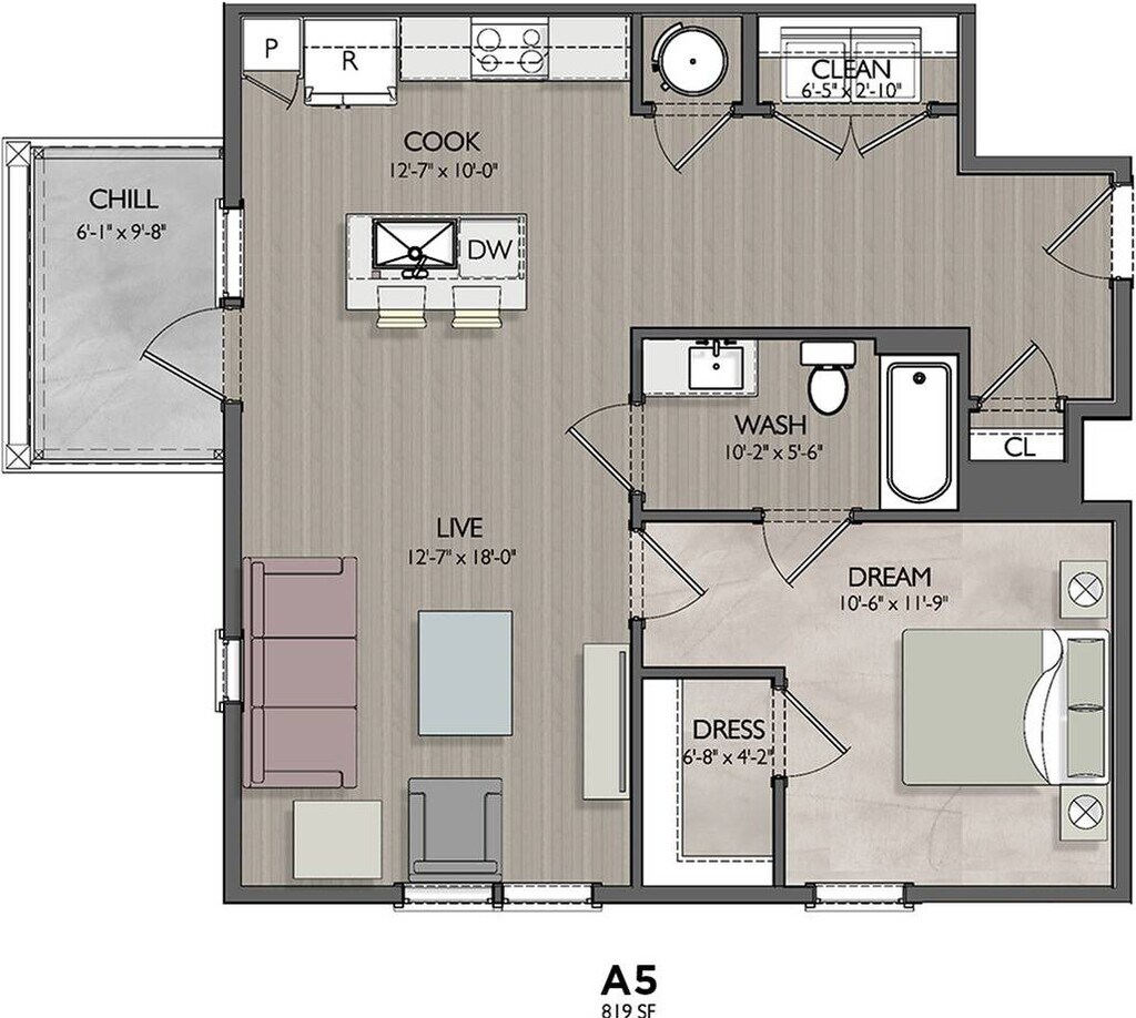 Modelo de apartamento: A5Desde $1,3031 Dormitorio, 1 Baño, 819 sq ftDisponible AhoraLos planos de la planta son una interpretación artística. Todas las dimensiones son aproximadas. Los tamaños o el detalle del producto real y sus especificaciones pueden variar. No todas las características están disponibles en todos los hogares para rentar. Los precios y la disponibilidad están sujetos a cambios. El alquiler que se muestra es mensual. Se pueden aplicar ciertos cargos, por ejemplo, entrega de paquetes, recolección de basura, agua, servicios, etc. Depositos varian. Consulta a un representante para conocer detalles.
