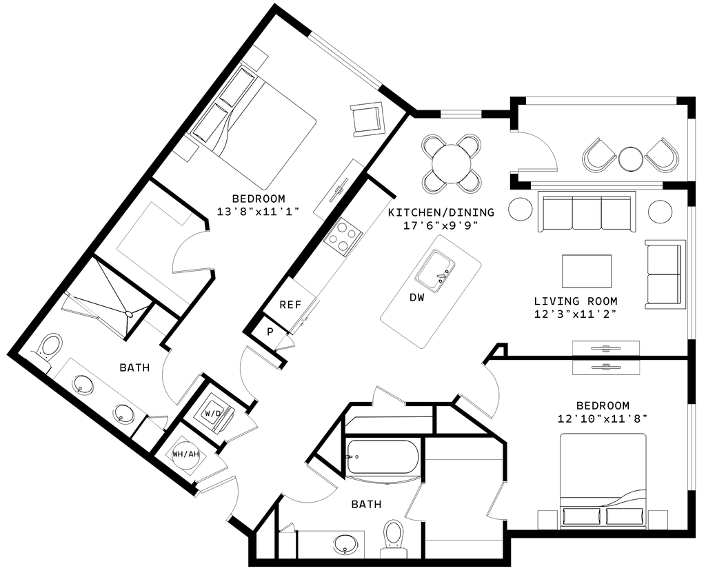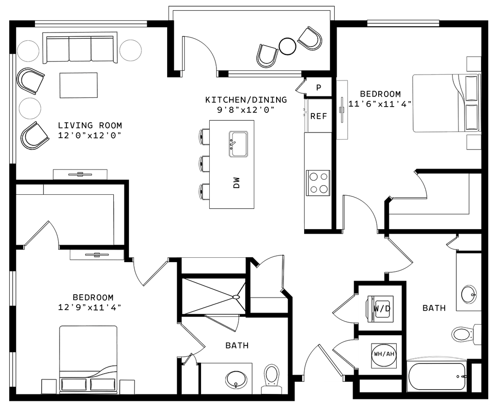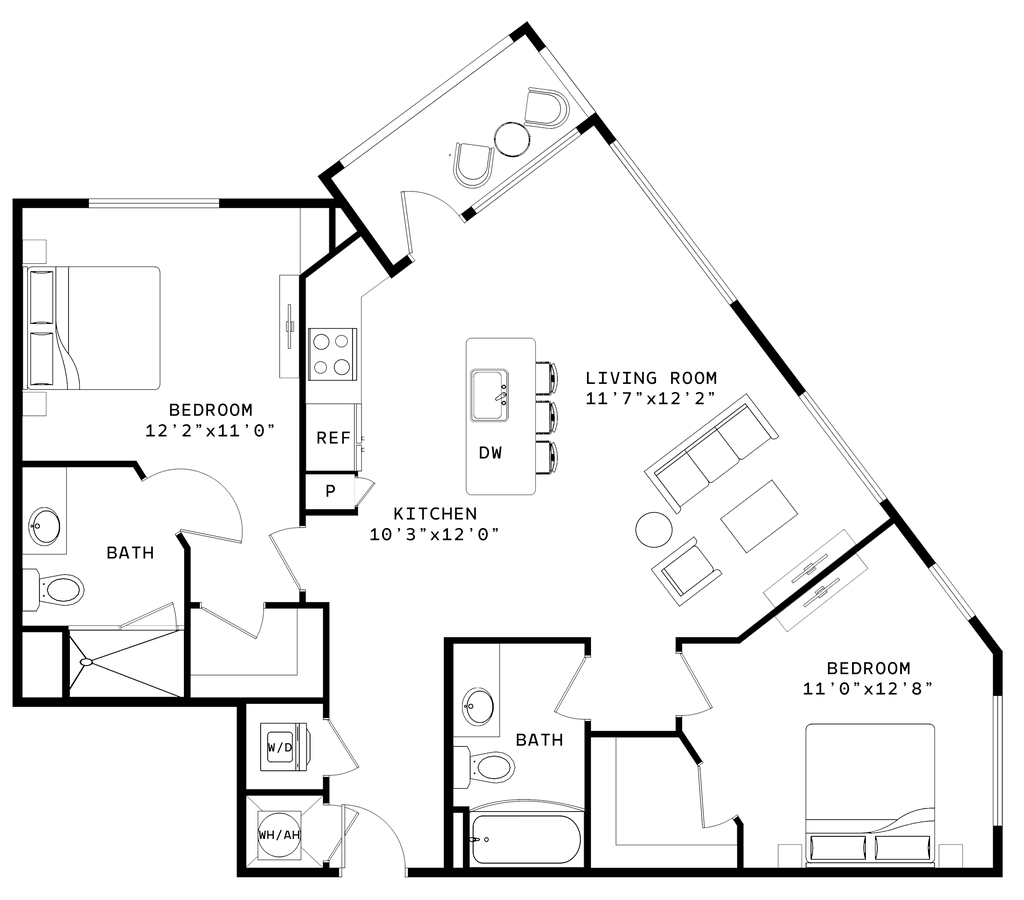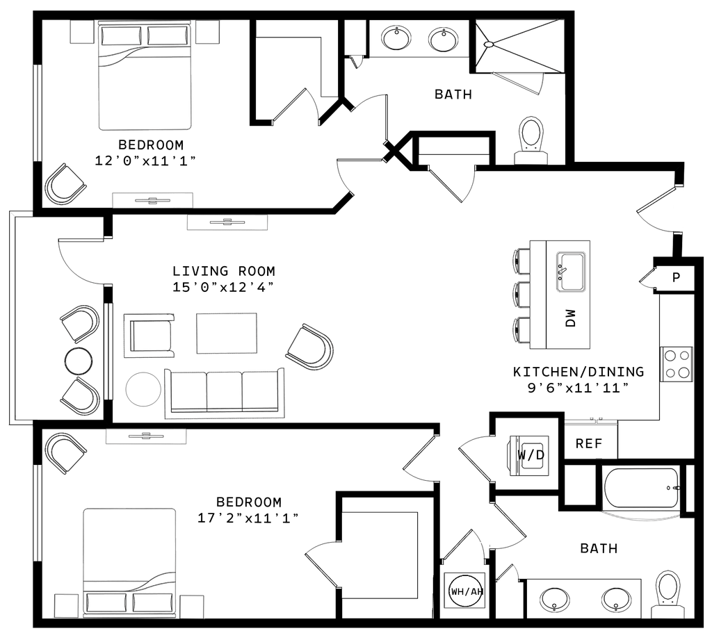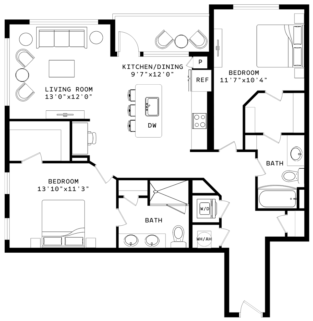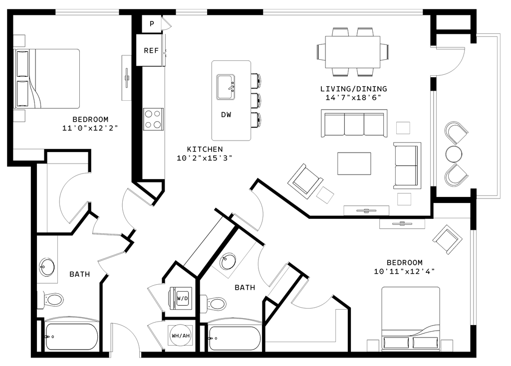 Modelo de apartamento: Walker2 Dormitorios, 2 Baños, 955 sq ftDisponible Ahora![]()