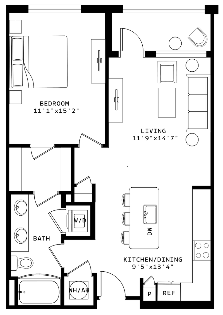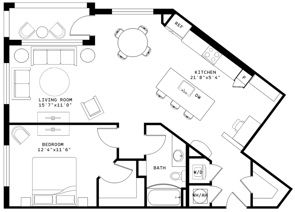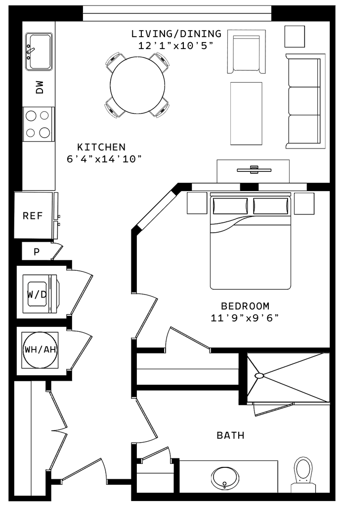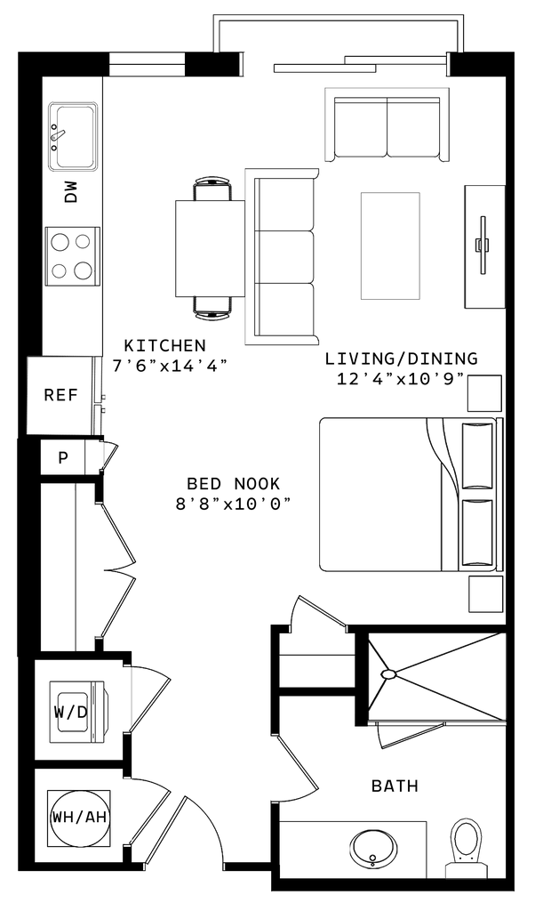 Foster - Plano 1 Unidad de apartamento: 534Modelo de apartamento: Foster1 Dormitorio, 1 Baño, 853 sq ftDisponible AhoraFuller