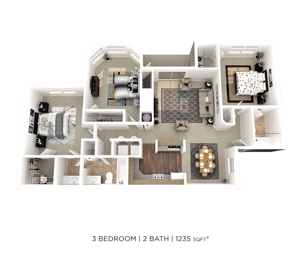 Modelo de apartamento: Three Bedroom 2 BathDesde $1,3353 Dormitorios, 2 Baños, sq ftDisponible November 21, 2025![]()