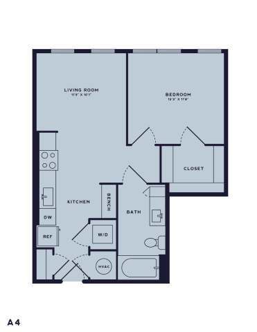 A4 - Plano 1 Unidad de apartamento: 1434Modelo de apartamento: A4$1,7291 Dormitorio, 1 Baño, 617 sq ftDisponible AhoraPlano: A7