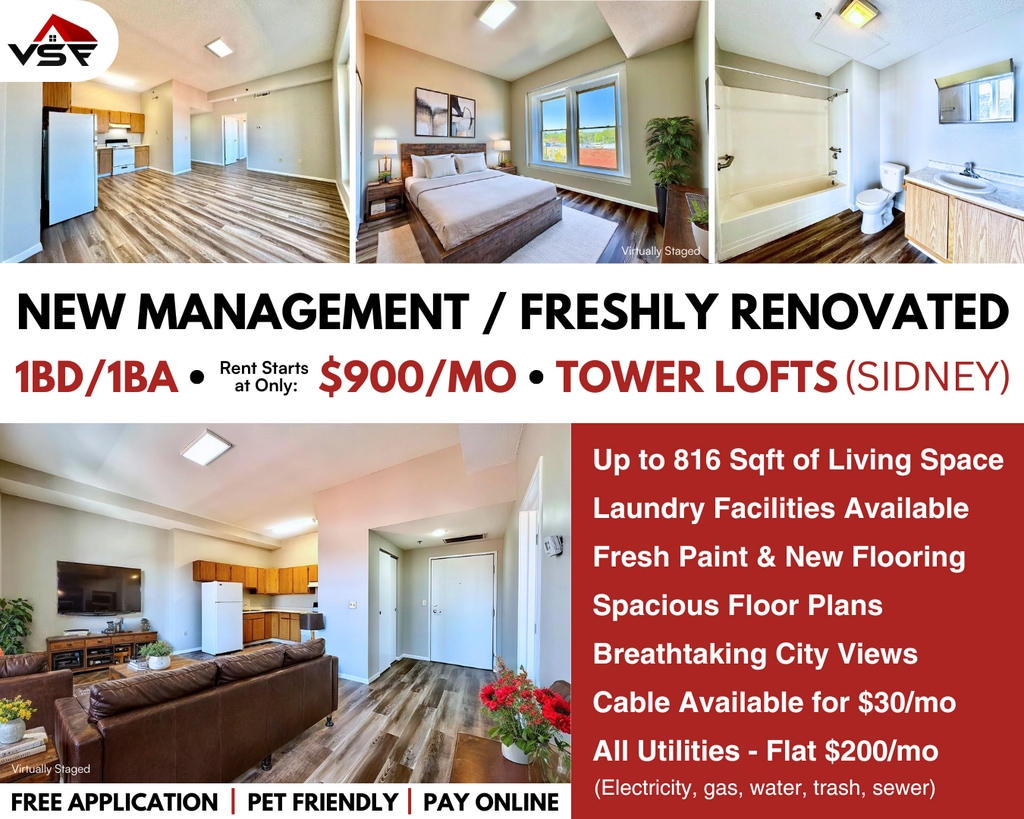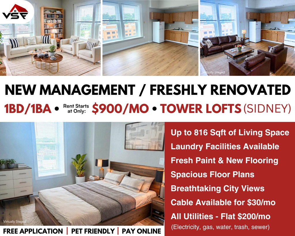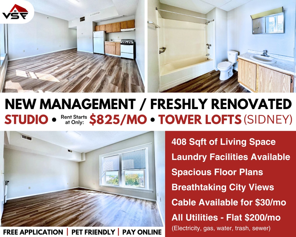 Price: Starting at $825/month Available Apartments: Studio, 1 BD / 1 BA, 2 BD / 1 BA Size: Up to 1,000 Sqft of Living Space **Features:** Fresh Paint and New Flooring Extra Large Living Room and Bathroom Washer and Dryer Available in Building Location: 6-story building with stunning views of Sidney Utilities: Flat fee of $200/month (Gas, Electricity, Water, Trash, Sewer) Cable available for $30/month **Description:** Rediscover luxury and comfort at Tower Lofts, recently renovated to meet contemporary living standards. Nestled in a 6-story building, our apartments range from spacious studios to 2-bedroom apartments. Freshly painted, new flooring, and a newly renovated entryway and common areas. The utility fee covers gas, electricity, water, trash, and sewer, making budgeting simple and stress-free. **Pet-Friendly** This property is pet-friendly. One-time $300 fee per pet and $35/mo per pet thereafter. 2 pet limit. **Application and Eligibility:** Free Application: At this time there is a $0 application fee when applying before or the same day of your tour. Click “Apply Now” to lock in this offer. Metro-approved unit - please ask for more information **Scheduling a Tour:** Interested in seeing the apartments? Schedule a tour today by clicking “Request a Tour” or “Contact Us”. Alternatively, you can call / text: or email
