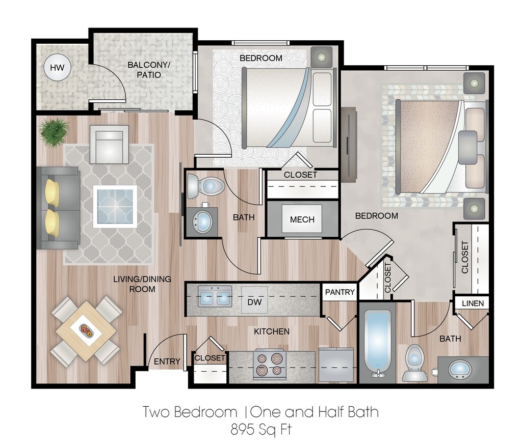Modelo de apartamento: Two Bedroom One and Half BathLlame para Precios2 Dormitorios, 1.5 Baños, 895 sq ftNo Disponible![]()