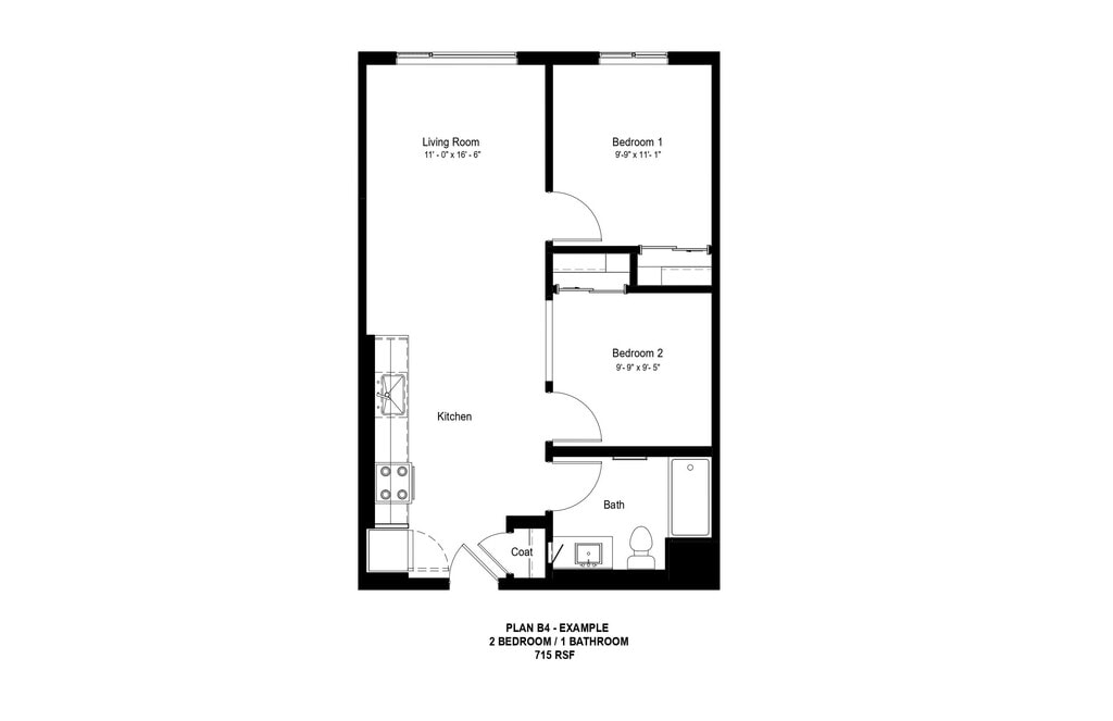 2 Dormitorios, 1 Baño, 715 pies²Disponible AhoraGalería del Modelo