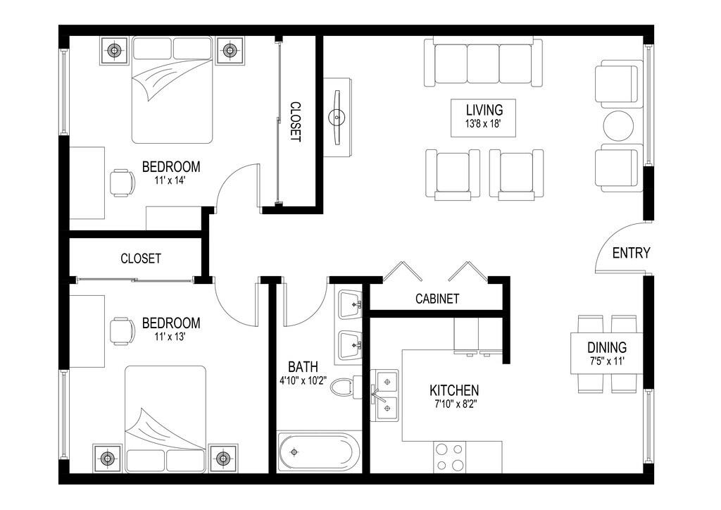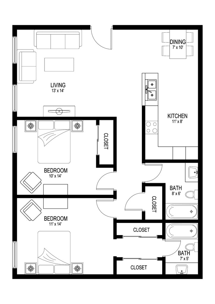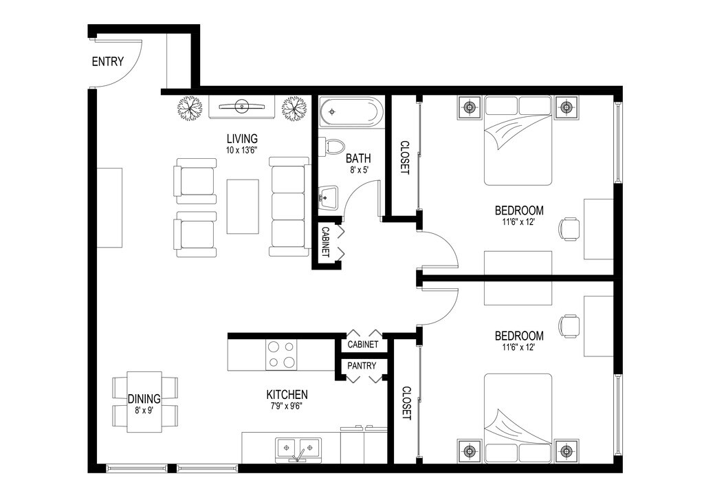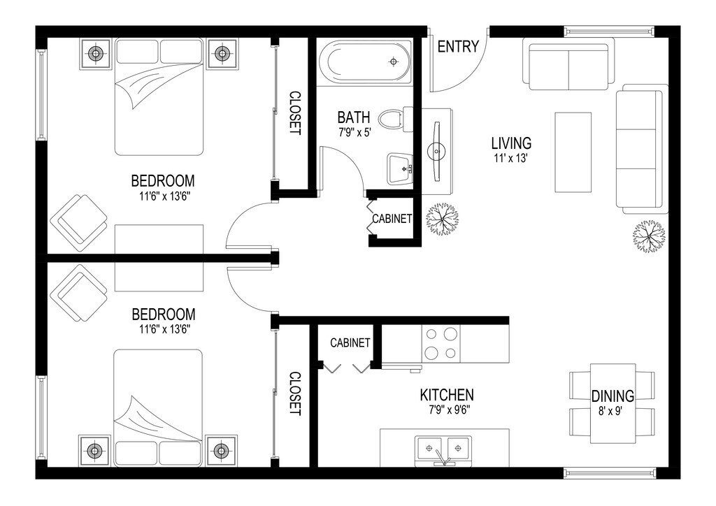 2 Dormitorios, 1 Baño, 800 pies²Galería del Modelo