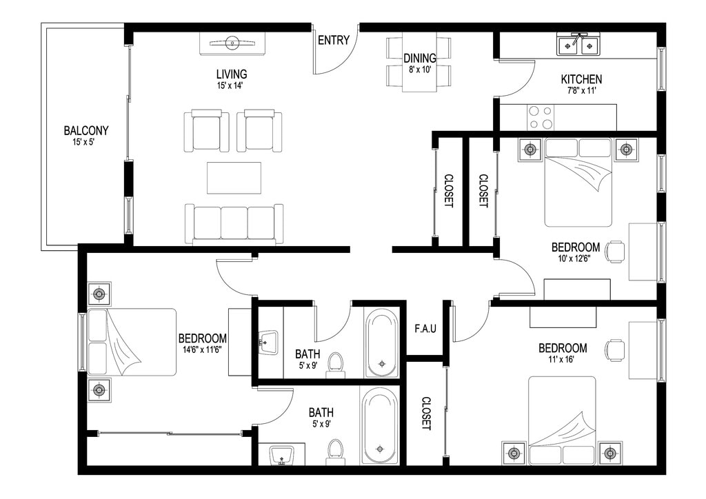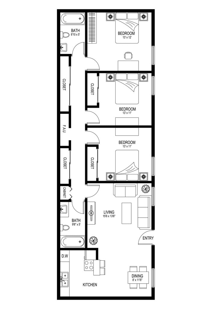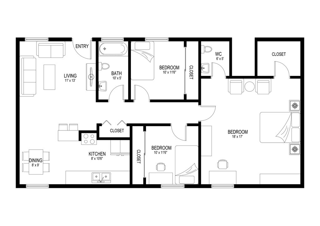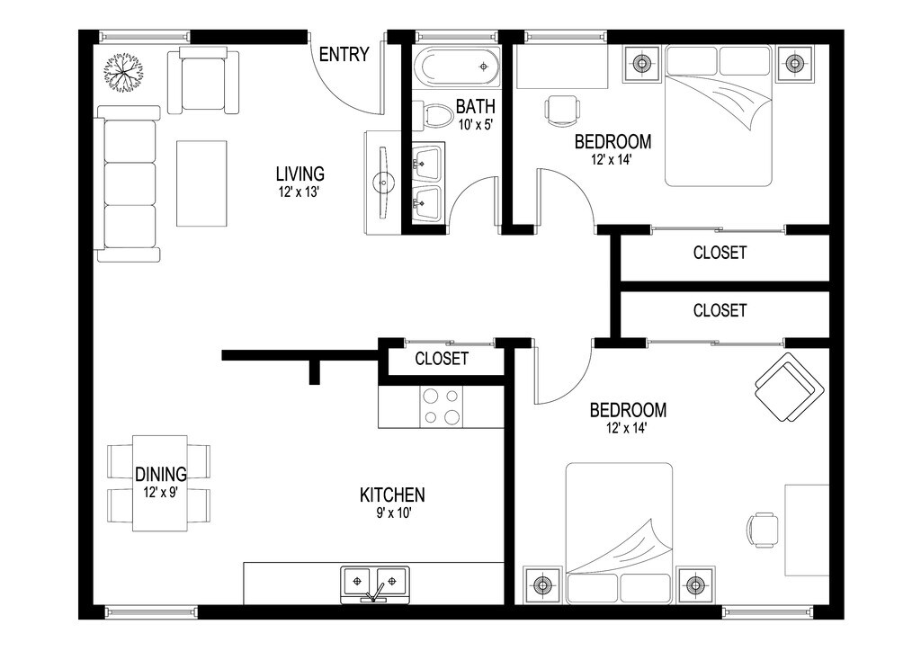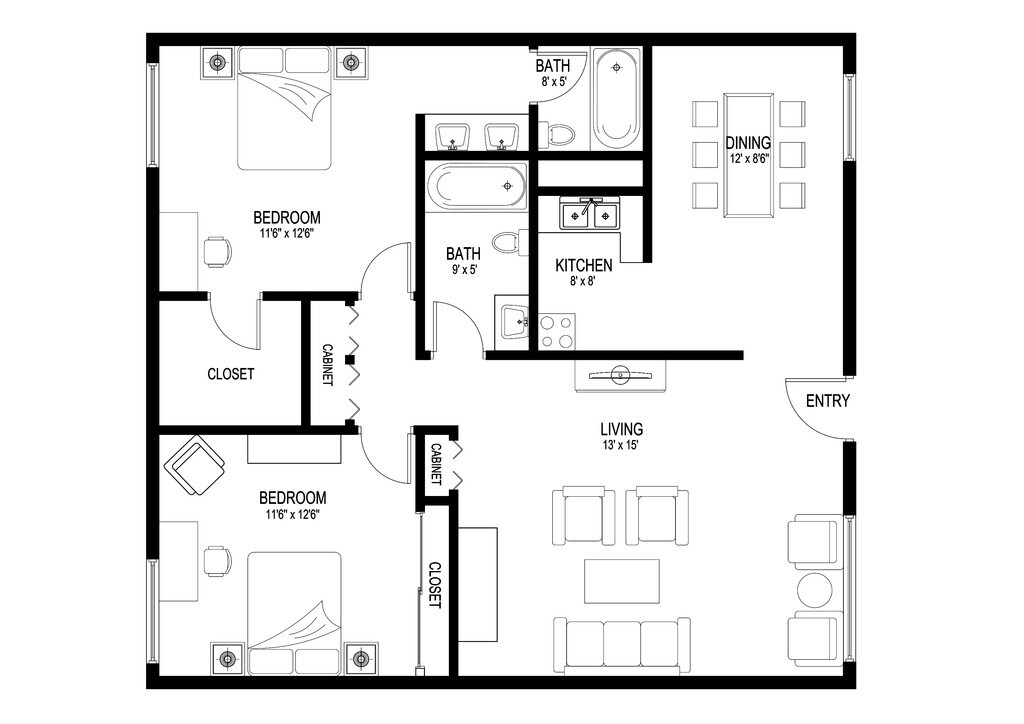 2 Dormitorios, 1 Baño, 800 pies²Galería del Modelo