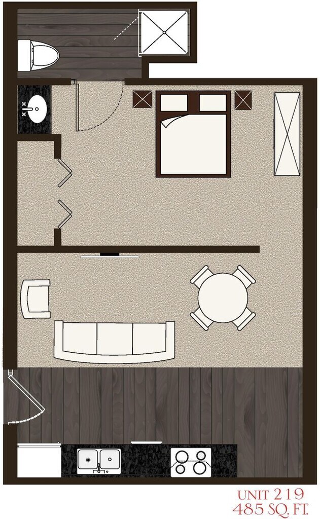 Unidad de apartamento: 219Modelo de apartamento: 1BR/1.0BA$1,1251 Dormitorio, 1 Baño, 485 sq ftDisponible December 30, 2025![]()