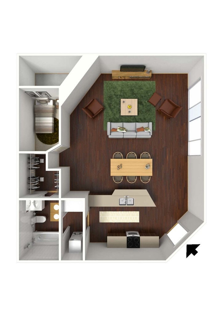 The Bedrock - Plano 1 Unidad de apartamento: FModelo de apartamento: The BedrockEstudio, 1 Baño, 480 sq ftDisponible Ahora1 Dormitorio
