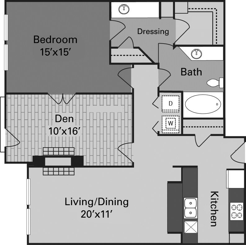 Fecha Disponibilidad Unidad Pies² No Disponible B1 + Den 1004 pies² Modelo de apartamento: B1 + Den1 Dormitorio, 1 Baño, 1004 sq ftNo Disponible![]()