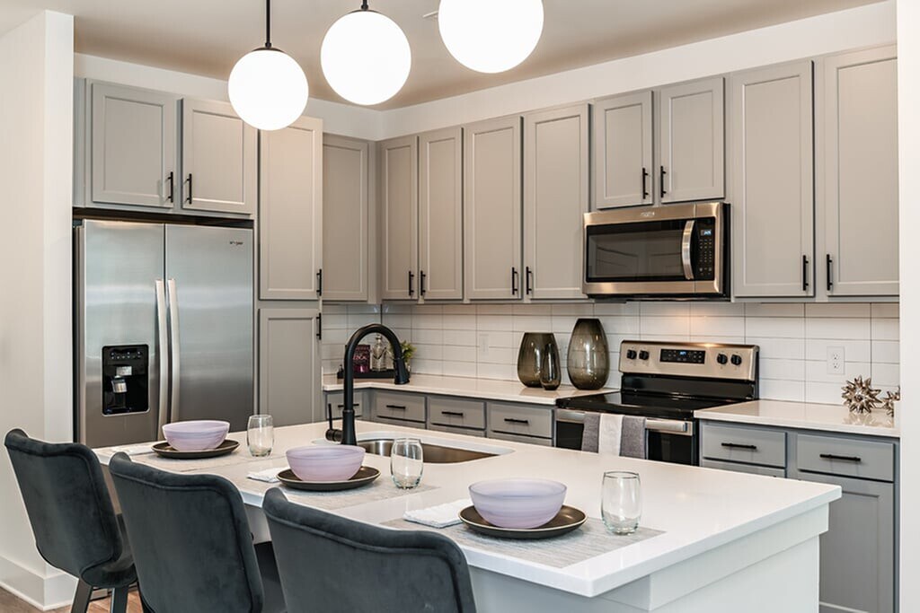 - Gabinetes Shaker grises en cocinas y baños