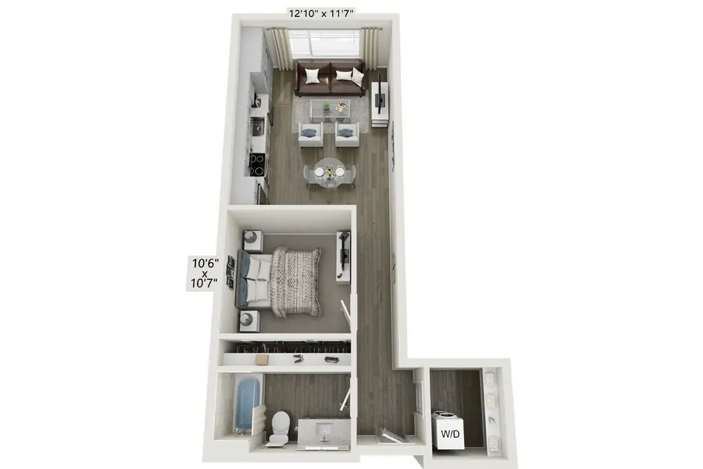 Modelo de apartamento: S1E$1,753Estudio, 1 Baño, 556 sq ftDisponible AhoraLos planos son representaciones artísticas. Todas las dimensiones son aproximadas. El producto y las especificaciones reales pueden variar en tamaño o detalle. No todas las características están disponibles en cada vivienda en alquiler. Por favor, consulta con un representante para obtener más detalles.