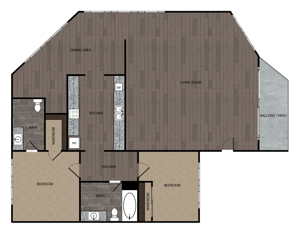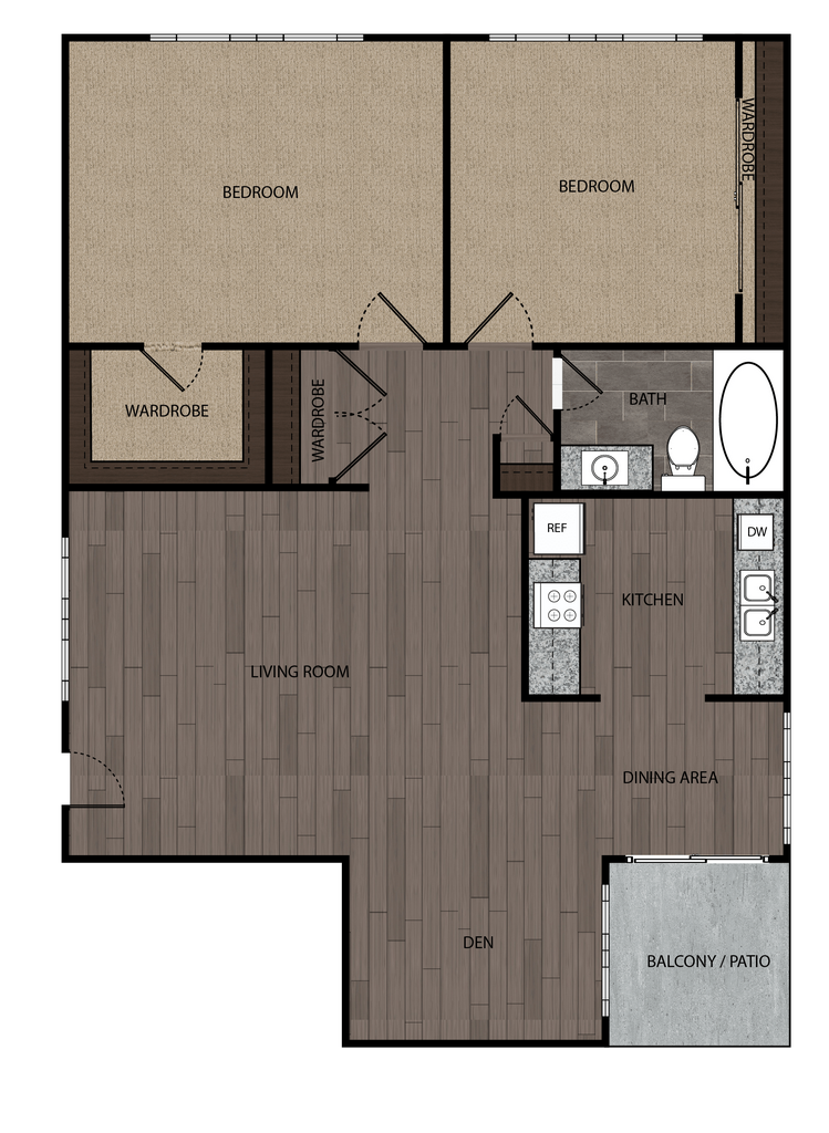 Modelo de apartamento: 2 Bed, 1 Bath, 840-1200 sf, (5)2 Dormitorios, 1 Baño, 965 sq ftDisponible Ahora![]()