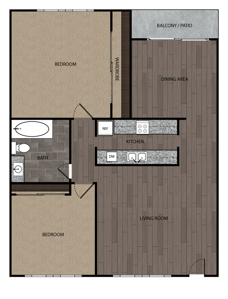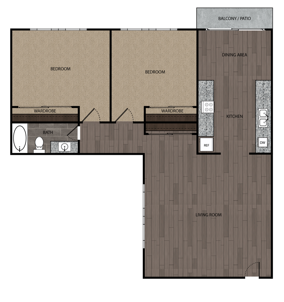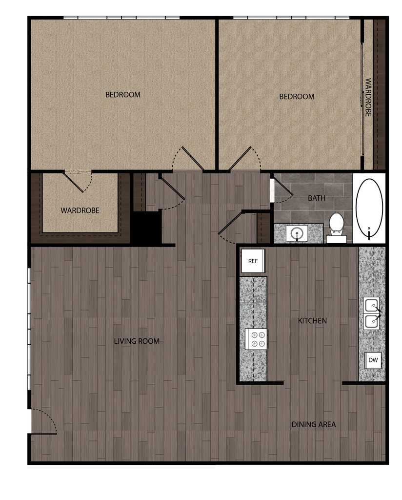 2 Dormitorios, 1 Baño, 965 pies²Disponible AhoraGalería del Modelo