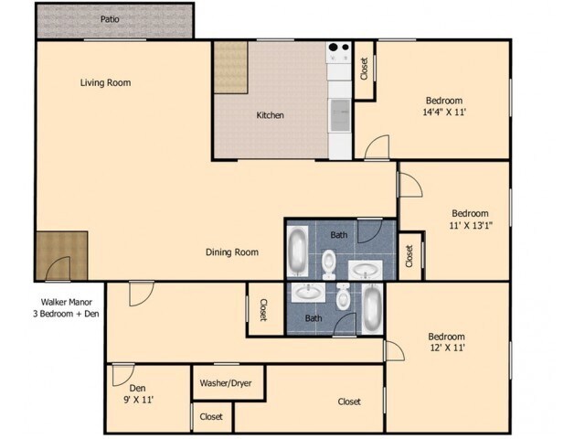 Modelo de apartamento: 3 Bedroom Den3 Dormitorios, 2 Baños, 950 sq ftDisponible December 15, 2025![]()