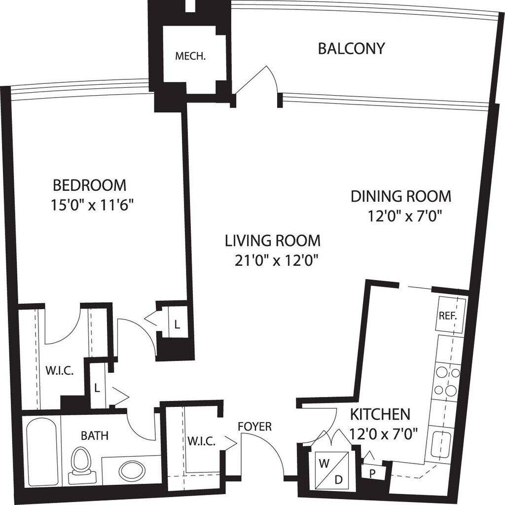 Modelo de apartamento: 1 Bedroom DLlame para Precios1 Dormitorio, 1 Baño, 675 sq ftNo Disponible![]()