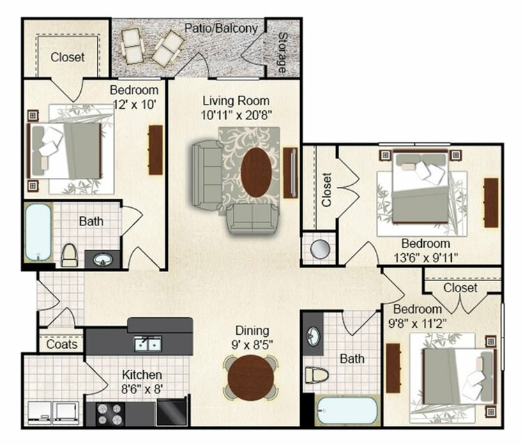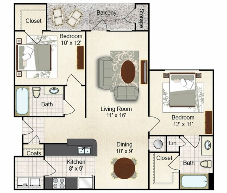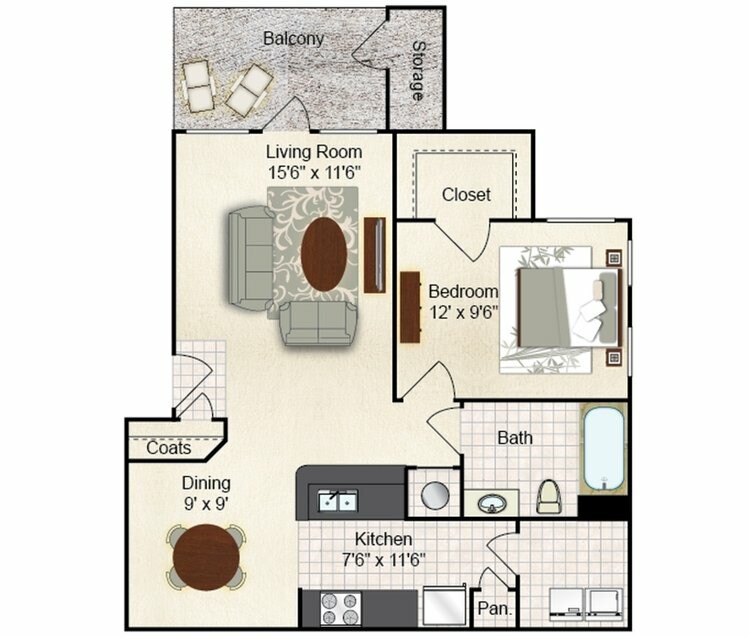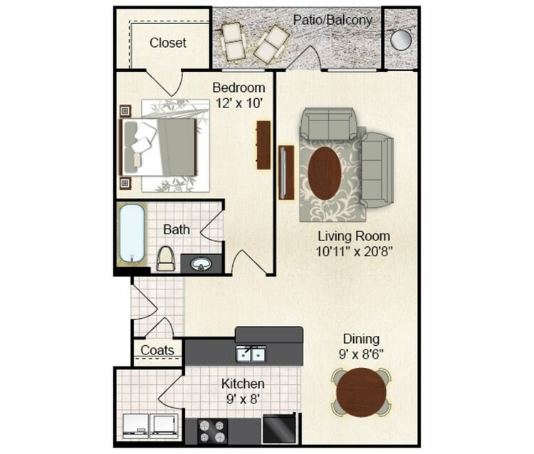 Modelo de apartamento: DogwoodDesde $1,1361 Dormitorio, 1 Baño, 693 sq ftDisponible Ahora![]()