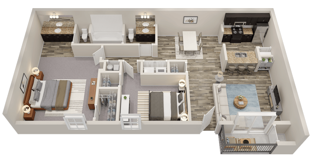 2 Dormitorios, 2 Baños, 1102 pies²Precio Mensual TotalDisponible AhoraGalería del Modelo