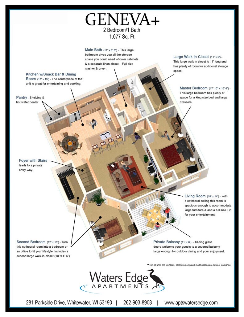 Modelo de apartamento: Geneva+$1,4652 Dormitorios, 1 Baño, 1077 sq ftDisponible July 11, 2026PlanosFotos![]()