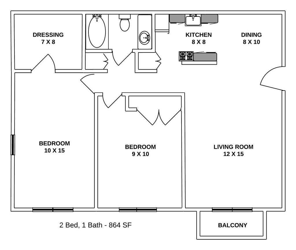 2 Dormitorios, 1 Baño, 864 pies²Galería del Modelo