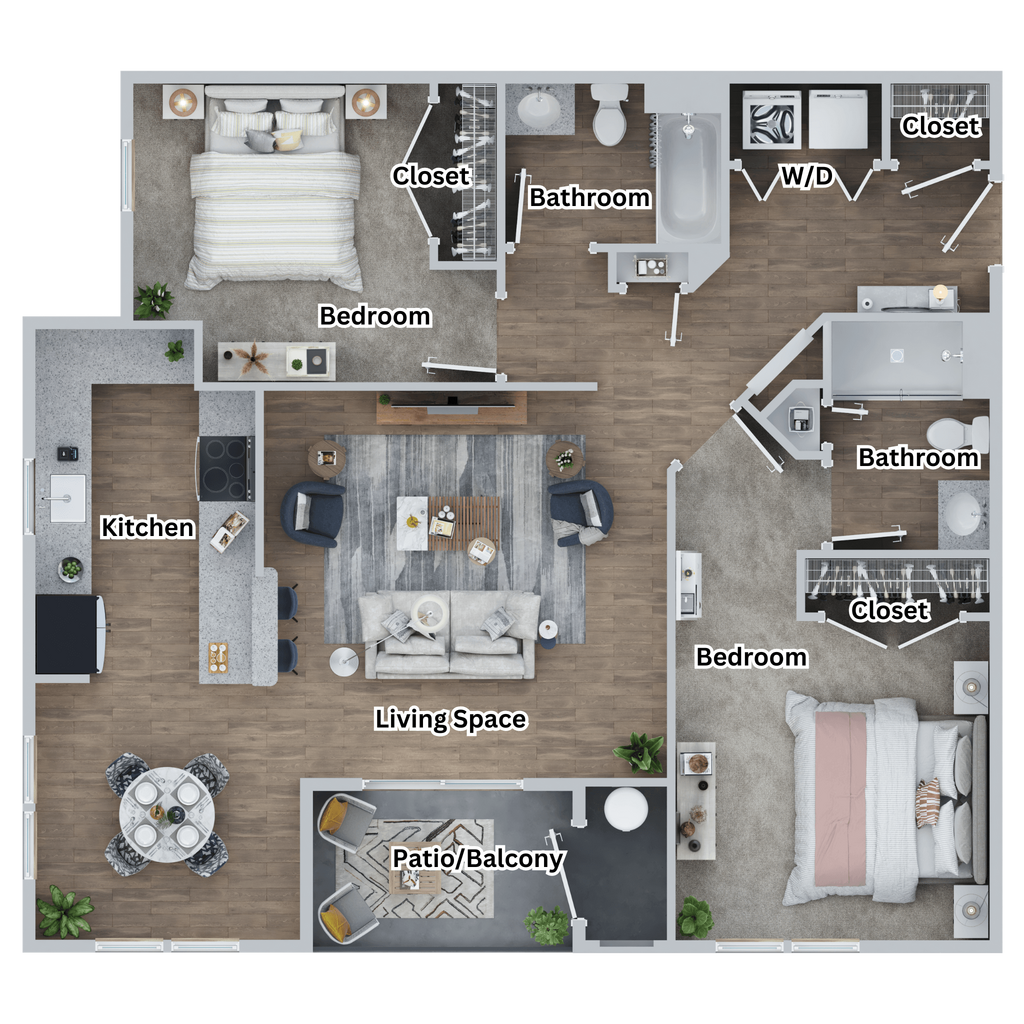 2 Bed 2 Bath - Plano 4 Los planos son representaciones artísticas. Todas las dimensiones son aproximadas. El producto y las especificaciones reales pueden variar en tamaño o detalle. No todas las características están disponibles en cada vivienda en alquiler. Por favor, consulta con un representante para obtener más detalles.
