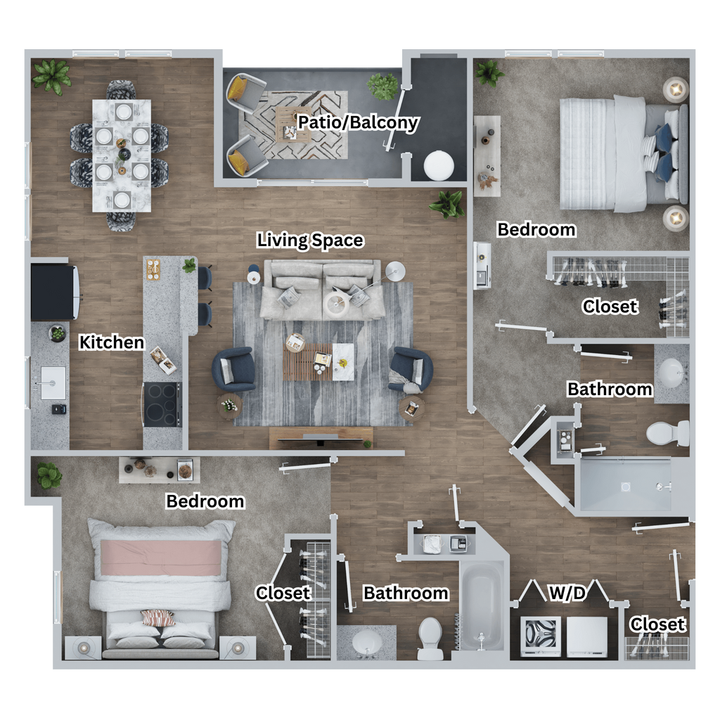 2 Bed 2 Bath - Plano 3 Los planos son representaciones artísticas. Todas las dimensiones son aproximadas. El producto y las especificaciones reales pueden variar en tamaño o detalle. No todas las características están disponibles en cada vivienda en alquiler. Por favor, consulta con un representante para obtener más detalles.