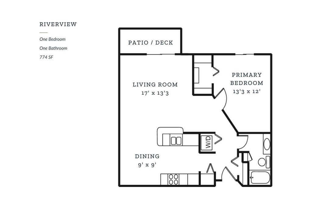 Modelo de apartamento: Riverview$1,5651 Dormitorio, 1 Baño, 774 sq ftDisponible March 6, 2026![]()
