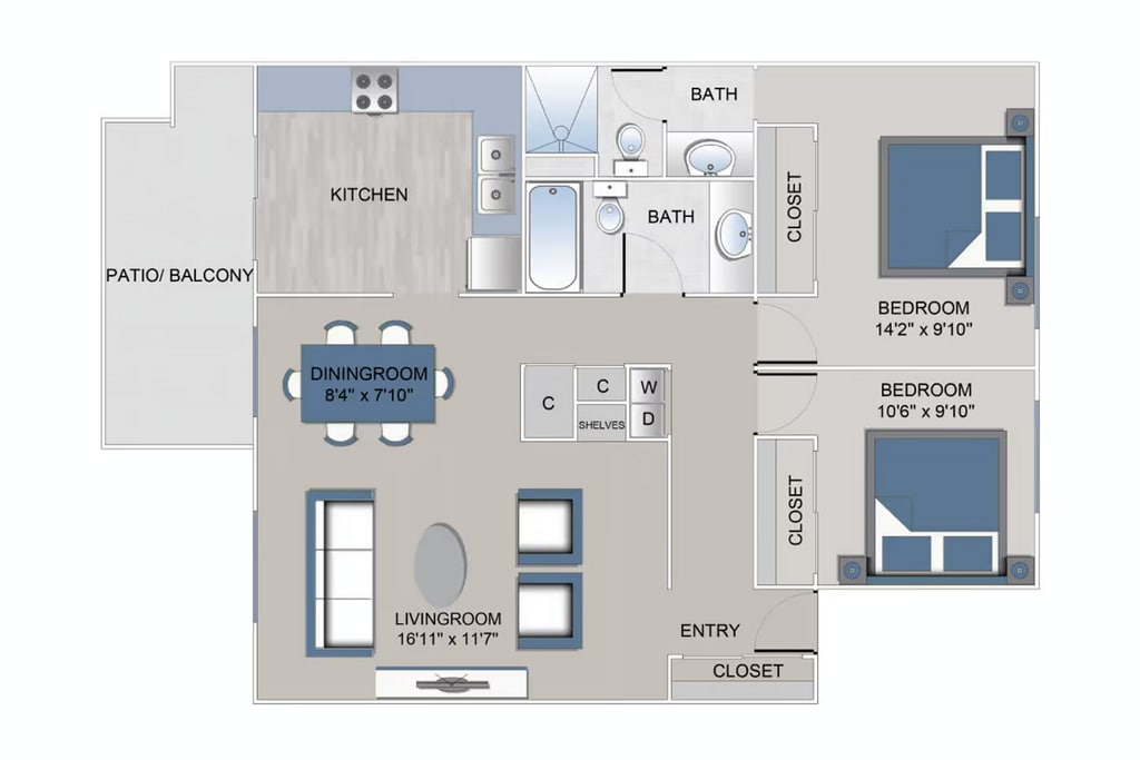Modelo de apartamento: 2 Bedroom, 2 BathDesde $1,9452 Dormitorios, 2 Baños, 1046 sq ftDisponible AhoraPlanosFotos![]()