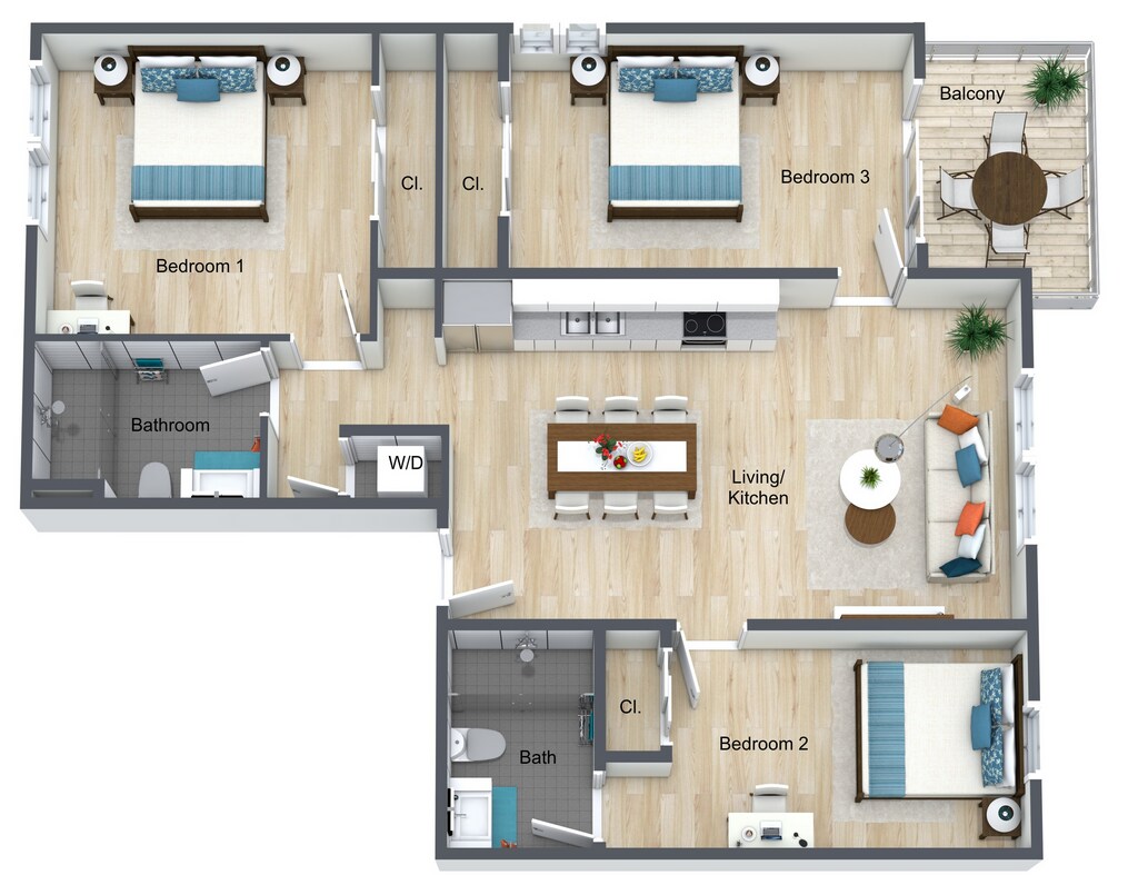 3 Dormitorios, 2 Baños, 900 pies²Disponible AhoraGalería del Modelo