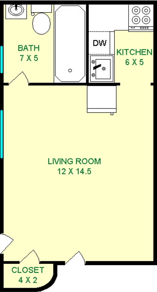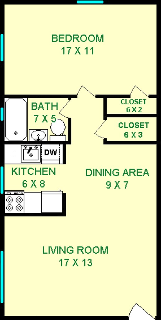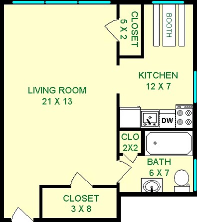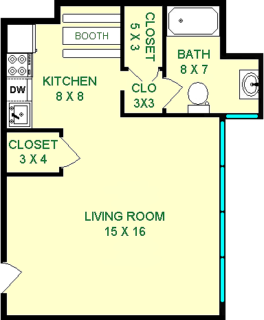Yew - Plano 5 Unidad de apartamento: KF-13Modelo de apartamento: YewEstudio, 1 Baño, 290 sq ftDisponible July 1, 2026![]()