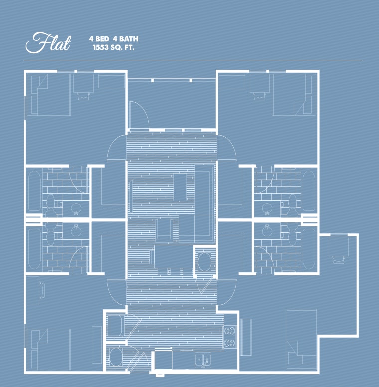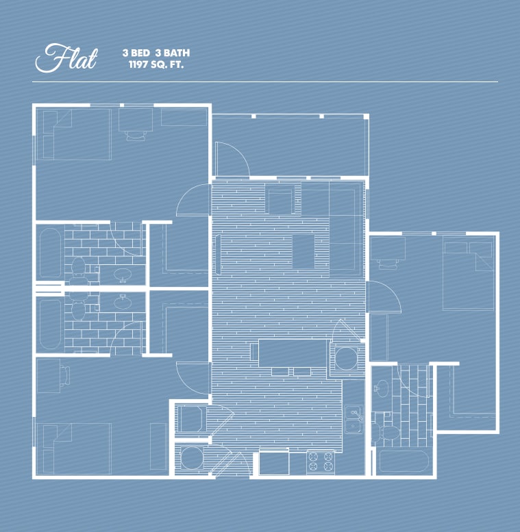 3/3 Flat - Plano 1 Unidad de apartamento: PrivateModelo de apartamento: 3/3 Flat3 Dormitorios, 3 Baños, 1125 sq ftDisponible August 14, 20263/3 Cottage