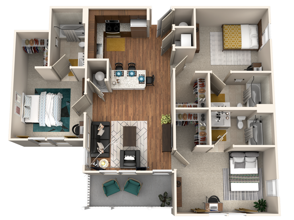 3/3 Cottage - Plano 2 Unidad de apartamento: Private PremiumModelo de apartamento: 3/3 Cottage3 Dormitorios, 3 Baños, 1404 sq ftDisponible August 14, 20264 Dormitorios
