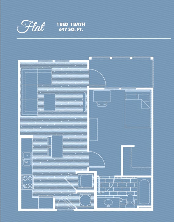 1/1 Flat - Plano 1 Unidad de apartamento: PrivateModelo de apartamento: 1/1 Flat1 Dormitorio, 1 Baño, 586 sq ftDisponible August 14, 20262 Dormitorios