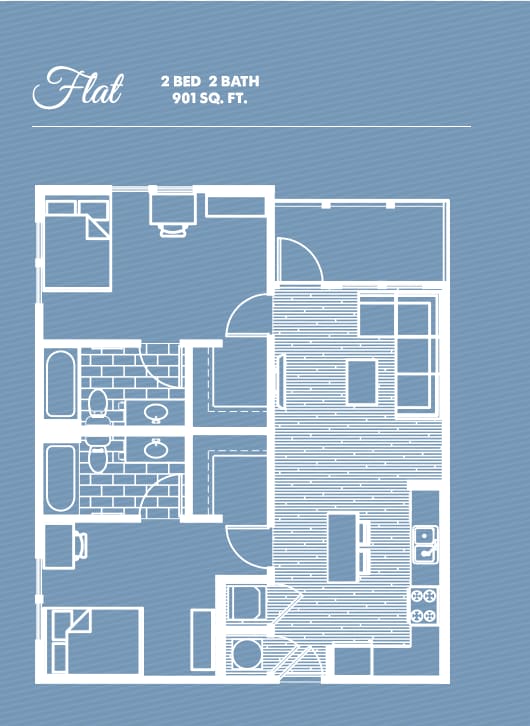 2/2 Flat - Plano 1 Unidad de apartamento: PrivateModelo de apartamento: 2/2 Flat2 Dormitorios, 2 Baños, 840 sq ftDisponible August 14, 20263 Dormitorios