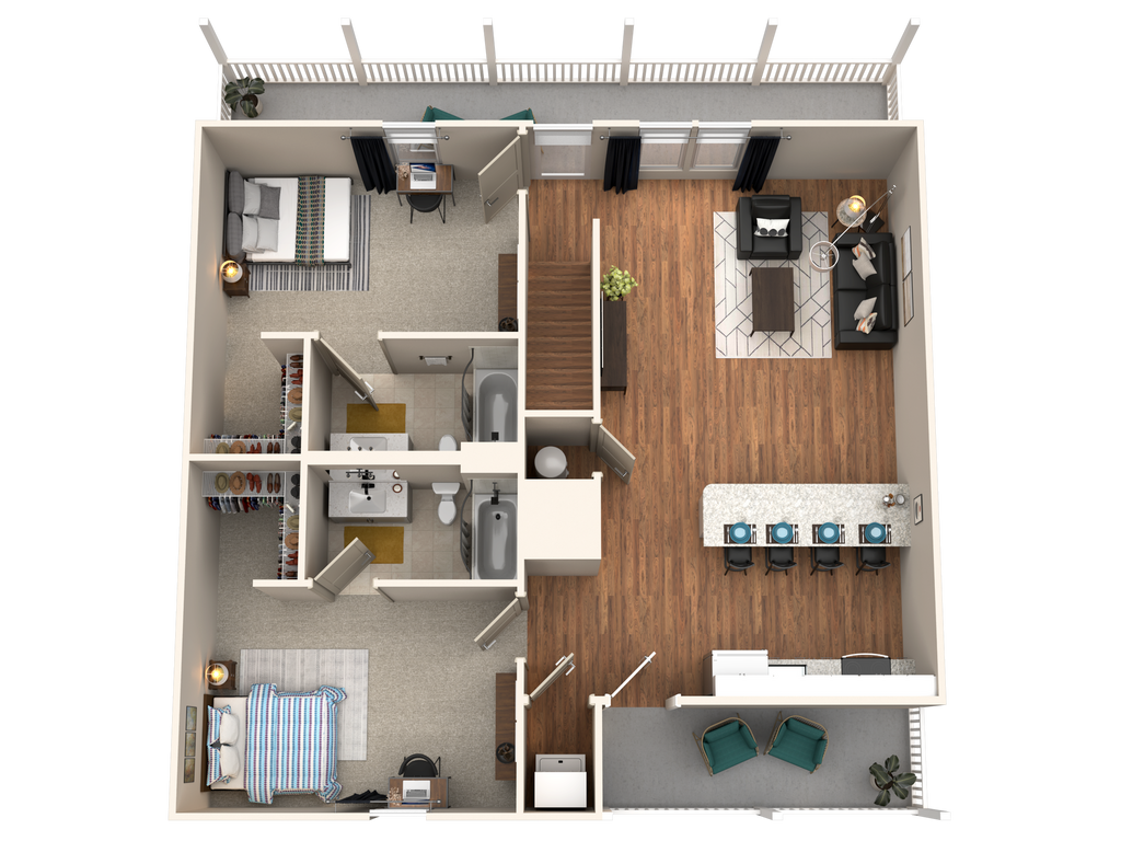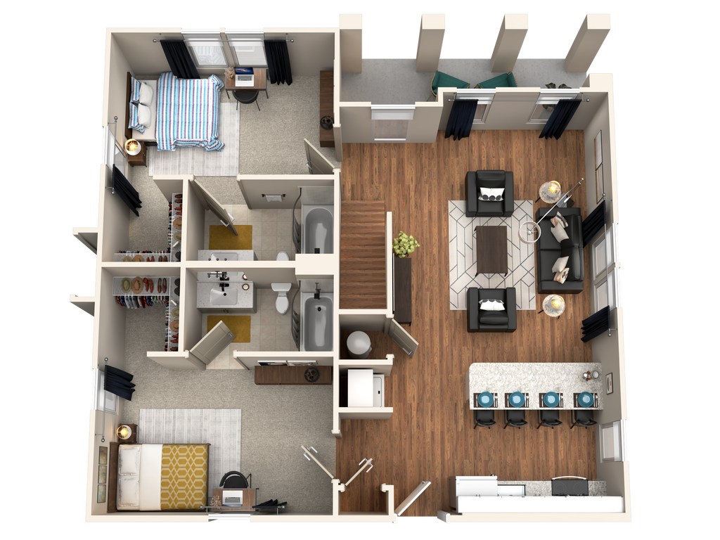 4/4 Flat - Plano 2 Unidad de apartamento: PrivateModelo de apartamento: 4/4 Flat4 Dormitorios, 4 Baños, 1412 sq ftDisponible August 14, 20264/4 Cottage