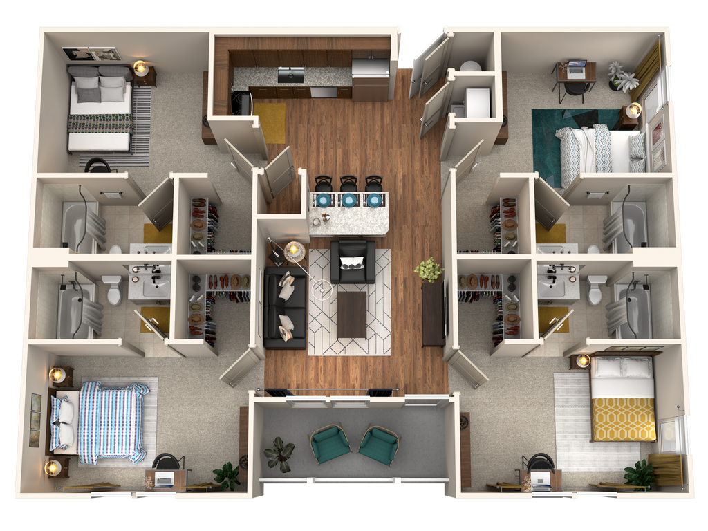 Modelo de apartamento: 4/4 Flat4 Dormitorios, 4 Baños, 1412 sq ftDisponible August 14, 2026![]()