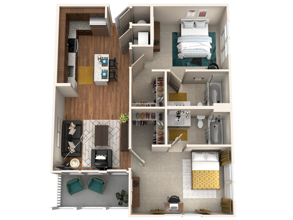 2/2 Flat - Plano 2 Unidad de apartamento: PrivateModelo de apartamento: 2/2 Flat2 Dormitorios, 2 Baños, 840 sq ftDisponible August 14, 20263 Dormitorios