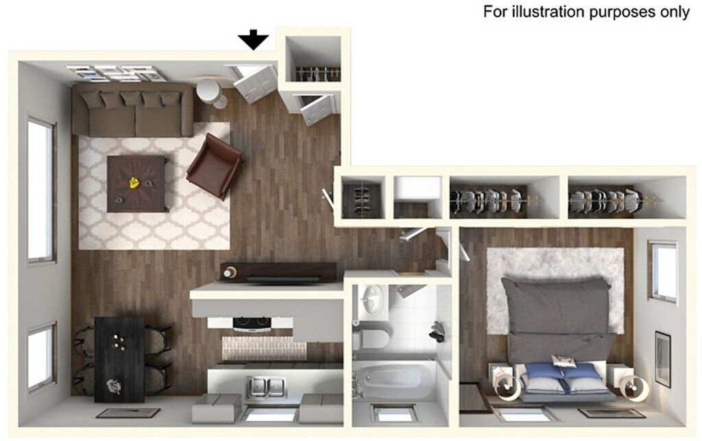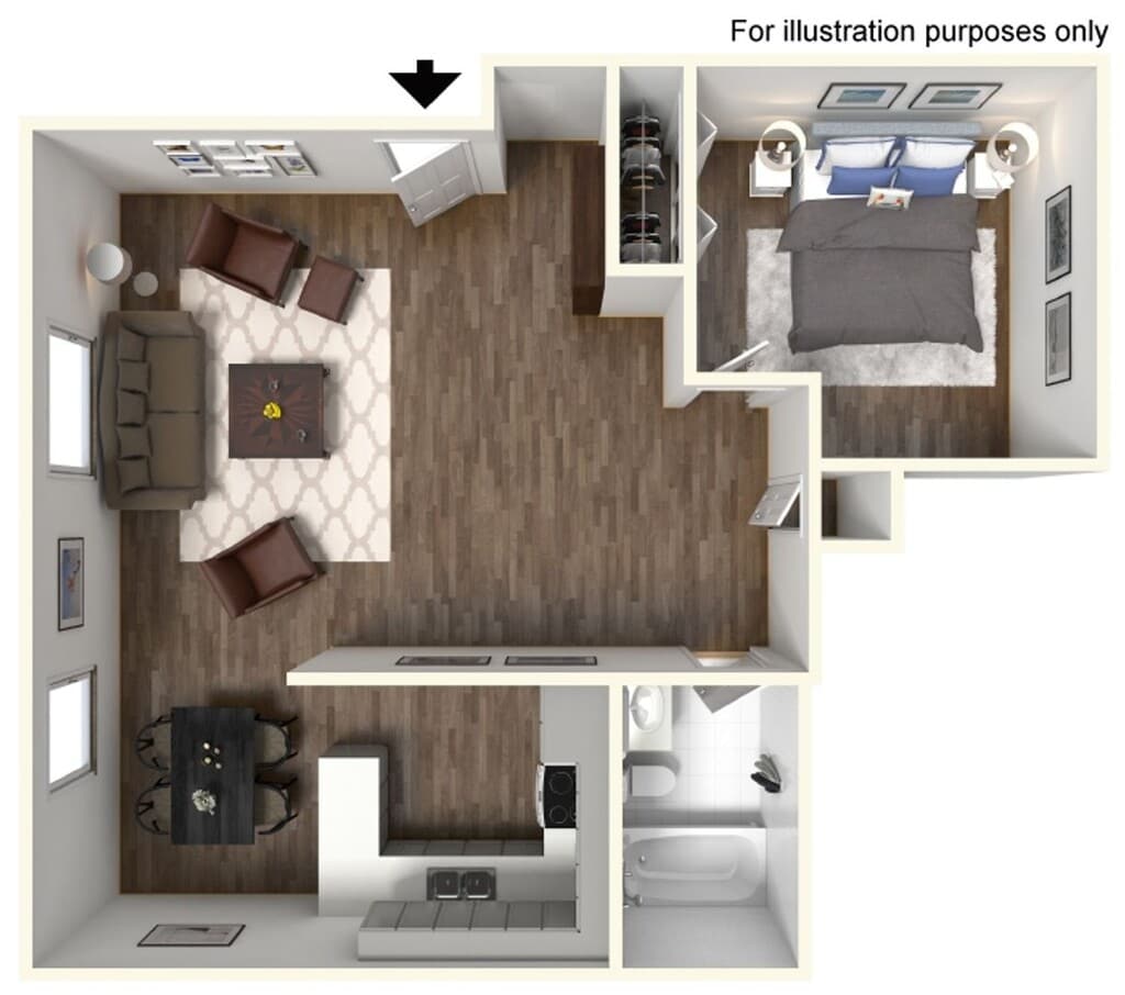 1 Dormitorio, 1 Baño, 600 pies²Disponible Aug 18, 2026Galería del Modelo