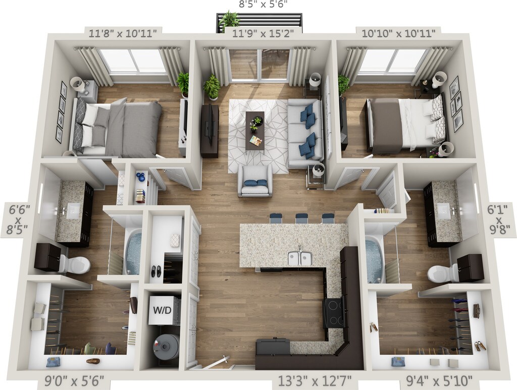 Modelo de apartamento: 1Desde $1,7651 Dormitorio, 1 Baño, 690 sq ftDisponible Ahora![]()