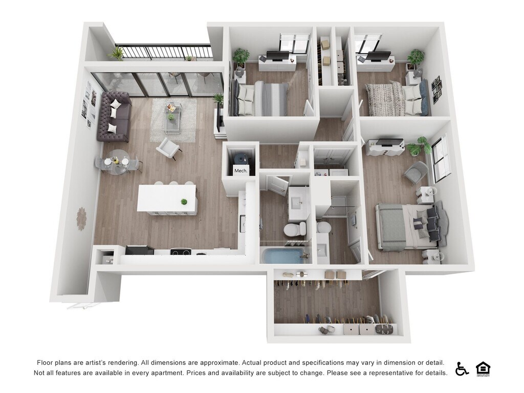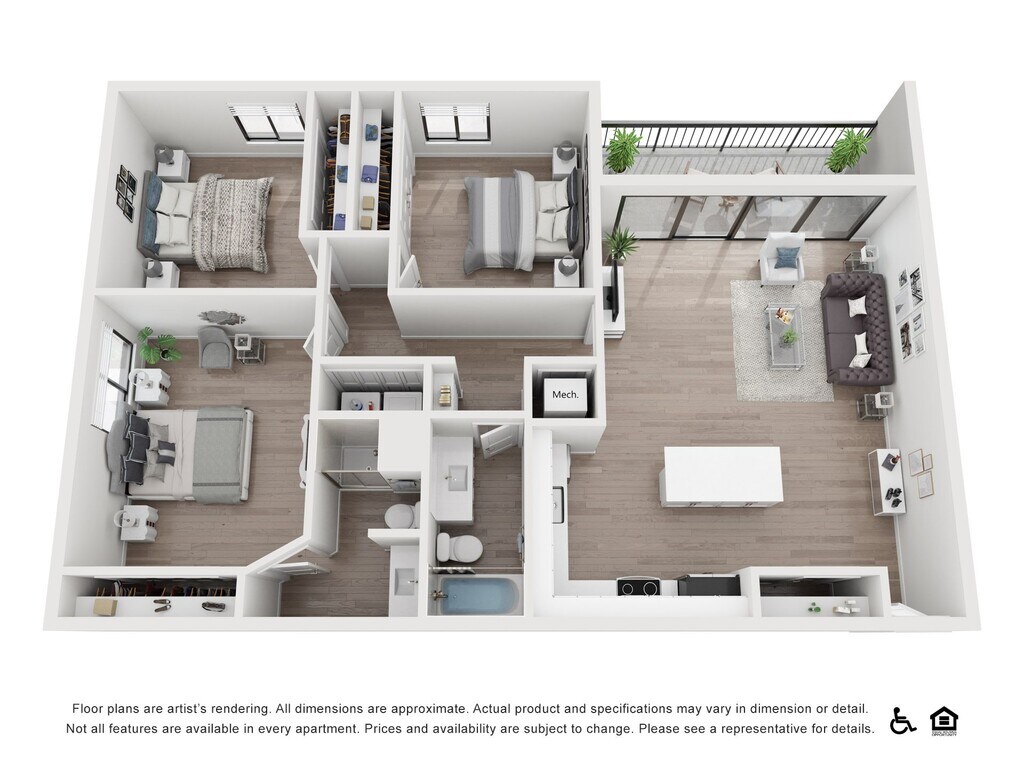 3 Bedroom 2 Bathroom B - Plano 1 Los planos de la planta son una interpretación artística. Todas las dimensiones son aproximadas. Los tamaños o el detalle del producto real y sus especificaciones pueden variar. No todas las características están disponibles en todos los hogares para rentar. Los precios y la disponibilidad están sujetos a cambios. El alquiler que se muestra es mensual. Se pueden aplicar ciertos cargos, por ejemplo, entrega de paquetes, recolección de basura, agua, servicios, etc. Depositos varian. Consulta a un representante para conocer detalles.