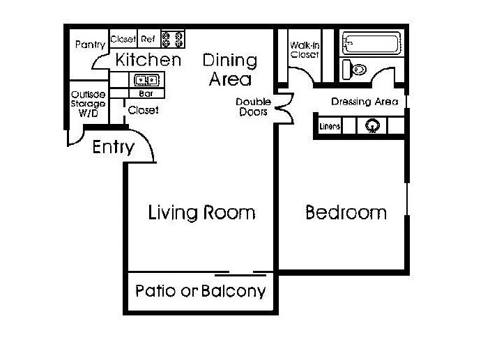 1 Bed 1 Bath - Plano 1 Los planos de la planta son una interpretación artística. Todas las dimensiones son aproximadas. Los tamaños o el detalle del producto real y sus especificaciones pueden variar. No todas las características están disponibles en todos los hogares para rentar. Los precios y la disponibilidad están sujetos a cambios. El alquiler que se muestra es mensual. Se pueden aplicar ciertos cargos, por ejemplo, entrega de paquetes, recolección de basura, agua, servicios, etc. Depositos varian. Consulta a un representante para conocer detalles.