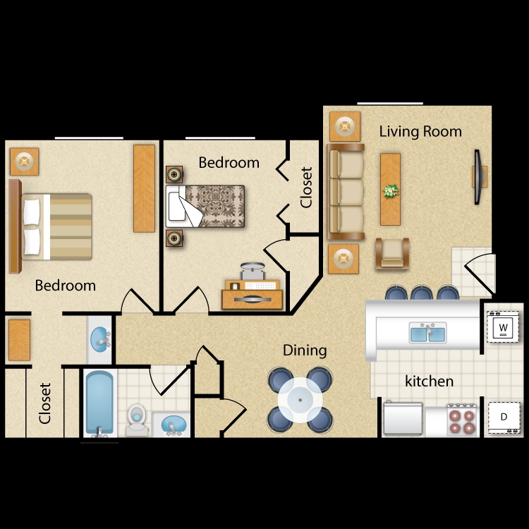2 Dormitorios, 1 Baño, 858-870 pies²Disponible AhoraGalería del Modelo