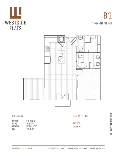 B1 - Plano 1 Unidad de apartamento: 303Modelo de apartamento: B1$2,2901 Dormitorio, 1.5 Baños, 921 sq ftDisponible AhoraPlano: A3